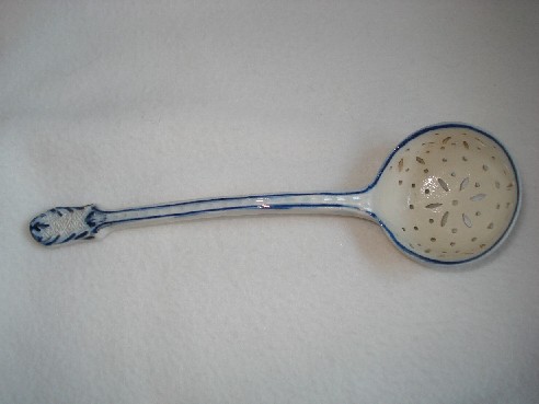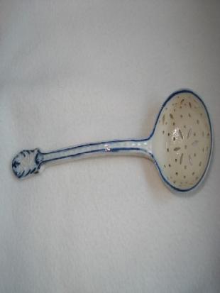 | Particularité(s) Ajours imitant la broderie dans le cuilleron. Manche légèrement recourbé orné d'un motif rocaille en relief à l'extrémité. Décor peint en camaïeu bleu de grand feu. Filets et rehauts.